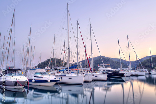 © Ramzi, Naklejka premium Yachts parking in harbor at sunset, Harbor yacht club in Gocek, Turkey