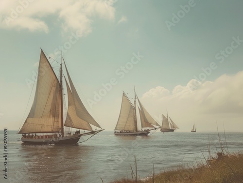Fototapeta premium Yachts sail across calm waters during a serene afternoon, showcasing graceful...