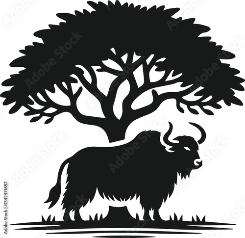 © MstSumi, Obraz premium Yak standing under a tree for shade vector silhouette