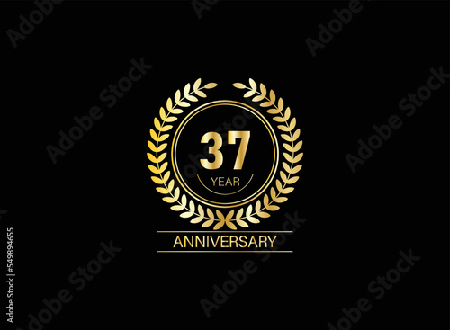 Fototapeta premium 37 year anniversary celebration. Anniversary logo with ring and elegance golden color isolated on black background, vector design for celebration.