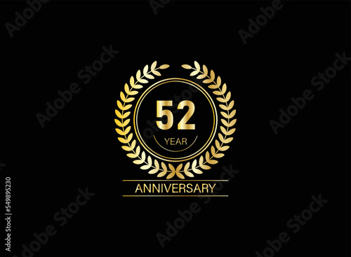 Fototapeta premium 52 year anniversary celebration. Anniversary logo with ring and elegance golden color isolated on black background, vector design for celebration.