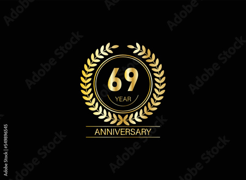 Fototapeta premium 69 year anniversary celebration. Anniversary logo with ring and elegance golden color isolated on black background, vector design for celebration.