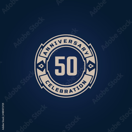 © Imnot99, Naklejka premium 50 Year Anniversary Celebration with Golden Color for Celebration Event, Wedding, Greeting card, and Invitation Isolated on Blue Background