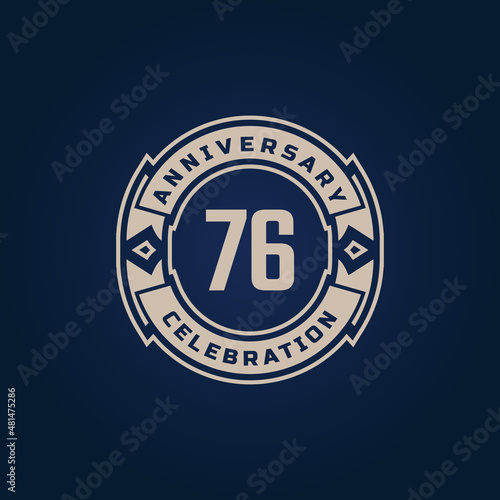 © Imnot99, Naklejka premium 76 Year Anniversary Celebration with Golden Color for Celebration Event, Wedding, Greeting card, and Invitation Isolated on Blue Background