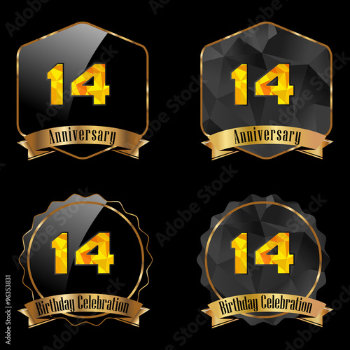 Naklejka premium 14 year birthday celebration golden label, anniversary decorative polygon golden emblem - vector illustration eps10