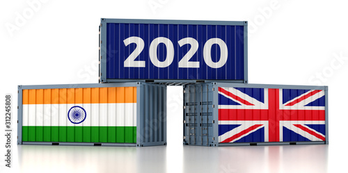 © Marius Faust, Fototapeta premium Year 2020 - Freight container with United Kingdom and India flag. 3D Rendering