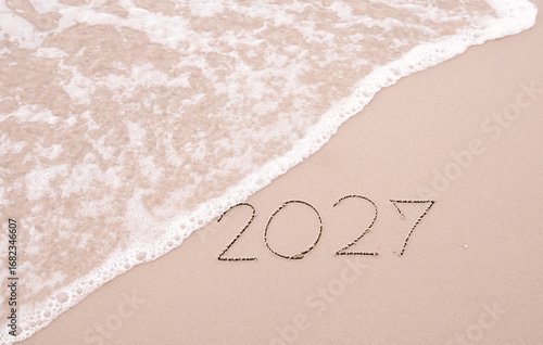 Fototapeta premium 2027 year handwritten with ocean waves on a sandy beach. New Year 2027 concept