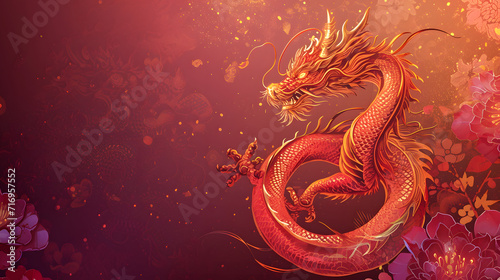 © iPhoto, Obraz premium Year of the Dragon. Chinese New Year 2024 Red Dragon and Flowers Illustration with Text Space