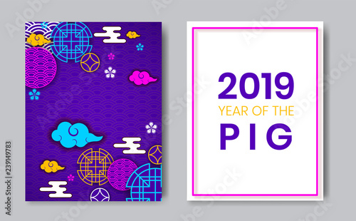 Obraz premium 2019 Year of the Pig chinese zodiac year,oriental chinese backdrop traditional circles,flowers,clouds.Happy New Year greeting card,web online concept,asian style background elements