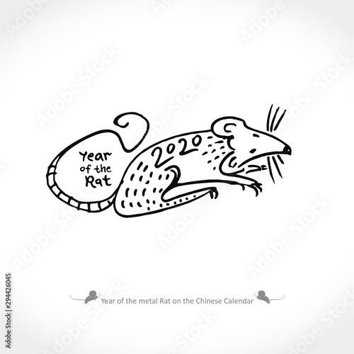 © difinbeker, Obraz premium Year of the Rat 2020 on the Chinese Calendar. Line art Rat and the inscription. Vector Illustration.