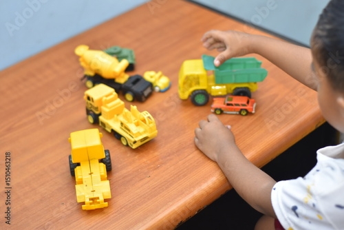 Obraz premium 3 year old boy playing with toy cars on wooden table