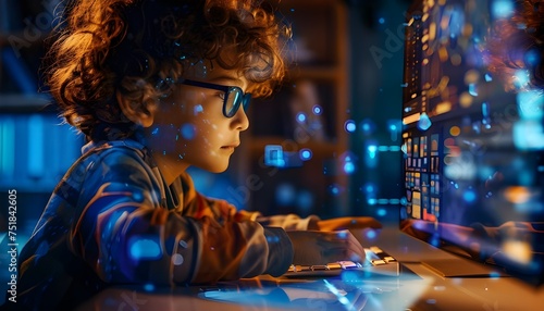 © Alejandro Morón, Obraz premium 6-year-old child working with artificial intelligence on a computer