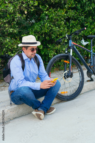 Obraz premium 40-year-old man checking his cell phone while sitting on the street with his bicycle