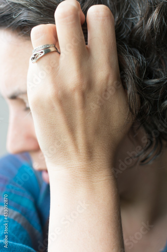 Obraz premium 40 year old woman touching graying curly hair; female embracing natural hair...