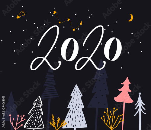 Naklejka premium 2020 year text, different numbers lettering inscription and illustration of Christmas trees. Night background with stars, winter forest greeting card.