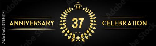 © VectoNations, Naklejka premium 37 years anniversary celebration logo with laurel wreath and royal crown isolated on black background. Premium design for happy birthday, wedding, celebration events, greetings card, graduation.