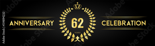 Naklejka premium 62 years anniversary celebration logo with laurel wreath and royal crown isolated on black background. Premium design for happy birthday, wedding, celebration events, greetings card, graduation.