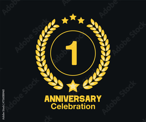 Naklejka premium 1 Years anniversary celebration. Vector luxury celebration with hoop, laurel and golden stars