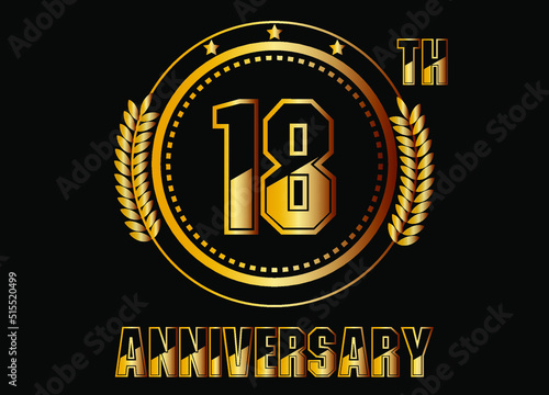 © BOROFOTOS, Fototapeta premium 18 years anniversary. Gold vector with rings for 18 years anniversary celebration on black background.