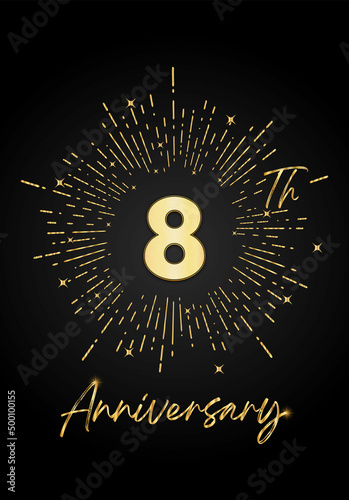 Fototapeta premium 8 years golden anniversary logo celebration with a firework on black background. 8 years anniversary card template. vector design for greeting cards, birthday, wedding events, and invitation card