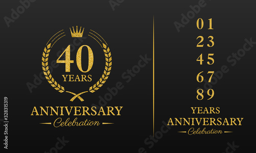 © Tajuddin, Fototapeta premium 40 years golden glitter anniversary celebration badge, additional elements added for compilation any dates or years. Vector illustration.
