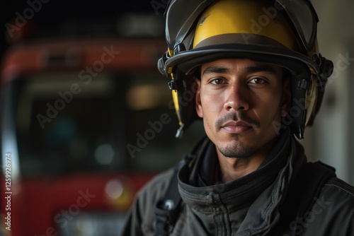 © ThomasLENNE, Fototapeta premium 40 years old Honduran male firefighter looking at camera against blurred firestation background.