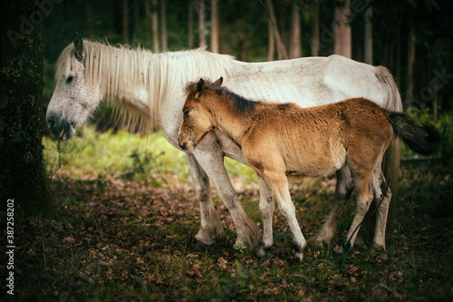 © Fuco Reyes, Obraz premium Yegua blanca con potro en un bosque