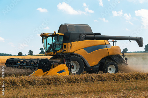 Obraz premium Yellov harvester on field harvesting gold wheat