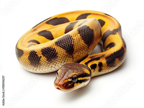 © Rapit, Fototapeta premium Yellow and black ball python coiled on white background. Stock photo for reptile, pet, wildlife, nature websites.