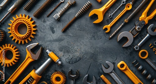 © olegganko, Fototapeta premium Yellow And Black Tools On A Dark Surface