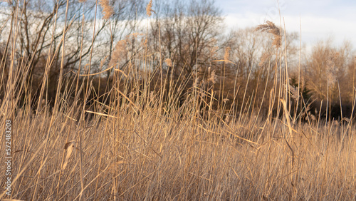 © Наталья Добровольска, Fototapeta premium Yellow and blue natural floral background, dry reeds on blue sky backdrop