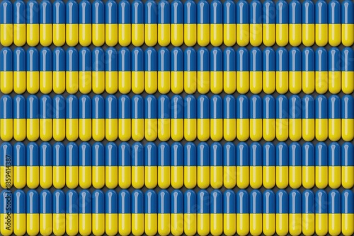 © Hairem, Fototapeta premium Yellow and blue pills on black surface. Top flat view