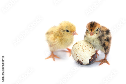 © chiew, Obraz premium Yellow and brown baby quail on a white background