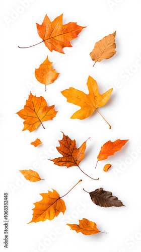 © Oksana_Latysheva, Fototapeta premium Yellow and brown dry leaves falling down in motion, isolated on white background