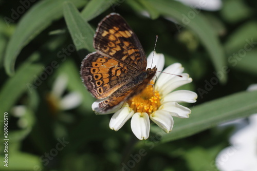Fototapeta premium yellow and brown moth with white flower