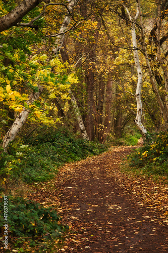 Naklejka premium Yellow and green leaves over a walking path strewn with leaves at Laacher See...