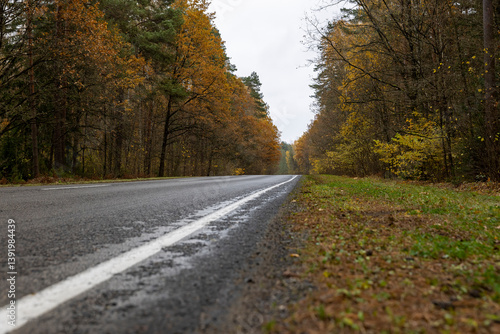 © rsooll, Obraz premium yellow and orange foliage falling on the road during the autumn leaf fall, side view