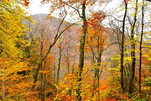 © kato08, Fototapeta premium Yellow and orange foliage in an autumn temperate, deciduous, broadleaf forest with beech and sycamore trees