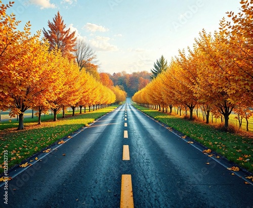 © Prasert, Obraz premium Yellow and orange leaves lining a country driveway, yellow, tree