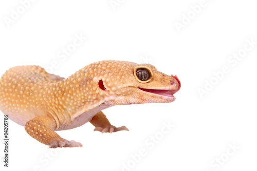 © Seleznov_Molchanova, Naklejka premium yellow and orange spotted leopard gecko on white