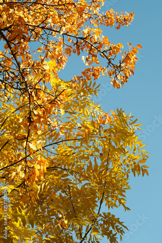 Fototapeta premium Yellow and red autumn leaves against a blue sky