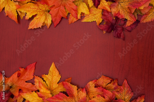© Karen Roach, Fototapeta premium Yellow and red fall leaves on wood background