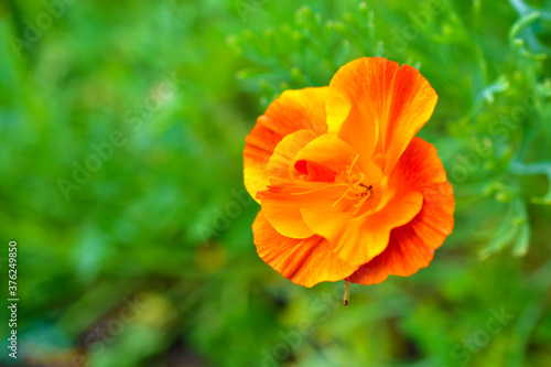 Fototapeta premium Yellow and red flowers Eshsholtsiya closeup in the green