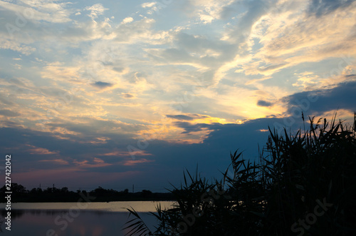 © Valerii, Obraz premium Yellow and red sunset over a calm river