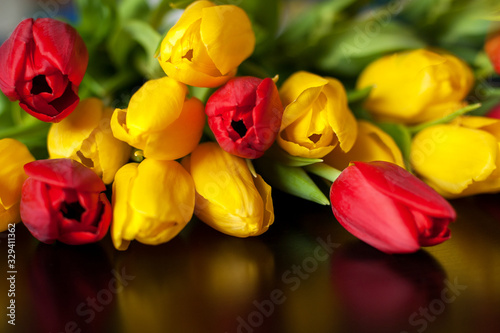 © Юлия Васильева, Fototapeta premium yellow and red tulips on a black background