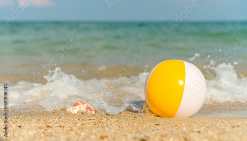 © Elon, Obraz premium Yellow and white beach ball on a sandy shore with gentle ocean waves.