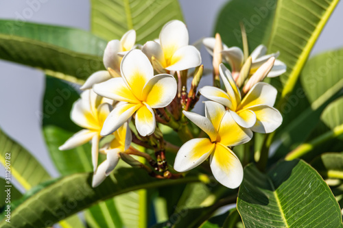 © Merrillie, Fototapeta premium Yellow and White Frangipani Flowers under a Smoke Filled Sky