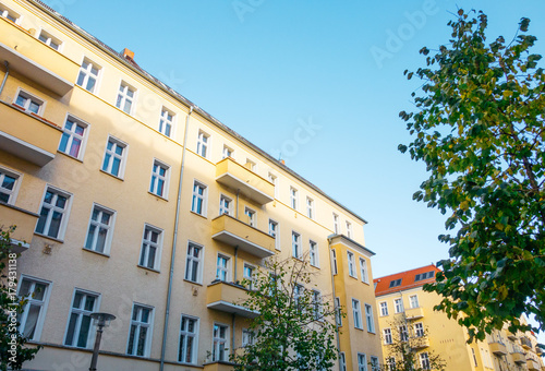© Novanture, Fototapeta premium yellow apartment building with green tree in hdr look