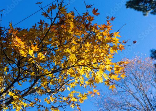 © Elise, Fototapeta premium Yellow autumn fall trees against a blue sky