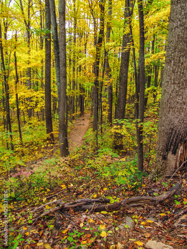 © Andriy Blokhin, Obraz premium Yellow autumn leaves in golden forest with path